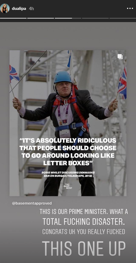 Dua Lipa shared a story in which she wrote, “This is our prime minister, what a total fu**ing disaster. Congrats UK, you really fu**ed this one up”, above an image that shows Johnson’s islamophobic statement discussing Denmark’s ban on burqas from 2018.