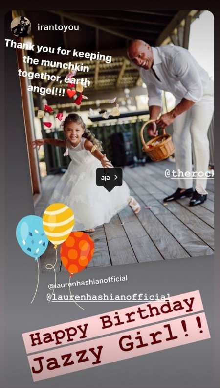Jasmine’s mother, Lauren Hashian, wished a happy birthday to her “sweet Munchie” in an Instagram story. She shared a picture of Dwayne and Jazzy taken at the couple’s wedding this year.