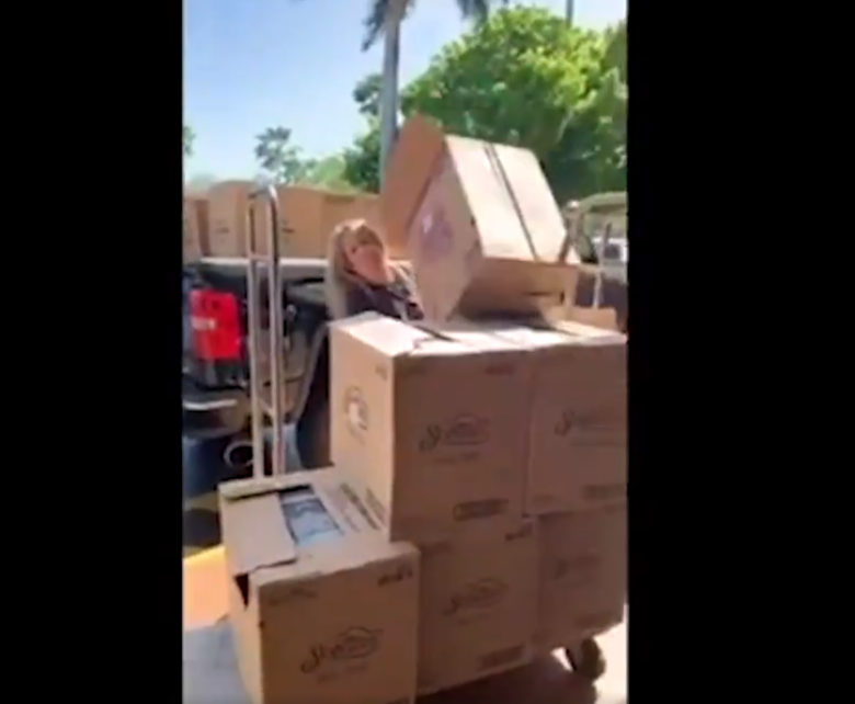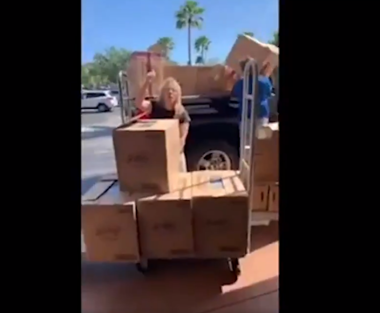 The woman who is recording tells a man off-screen. “She bought it all from the store, and she thinks it’s right and OK. I bet you she likes Donald Trump too,” and the woman loading boxes of toilet paper shouts: “Donald Trump. Go, Donald Trump!”